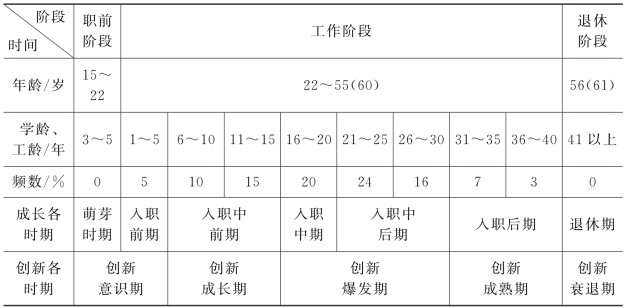 基于历届中华技能大奖获得者在基本信息、职业分布、知识产权、技术创新、科技成果、质量管理、工作室人才培养、技能竞赛、各种荣誉等9个一级指标统计分析的实证研究表明,发明创造和创新指标是大国工匠最本质、最主要的特征,最能体现个性因素。相对而言其他因素是一般性的、普遍性的次要特征,属于共性因素。因此,研究大国工匠成长的特殊规律,主要是看其创新能力周期和创新能力大小的变化规律,即创新指标的变化规律(见图9-2)。创新指标主要看发明创造的质量和数量,即专利情况。专利最能体现一个国家的创新能力和竞争力,也体现了一个人的创新能力和竞争力。