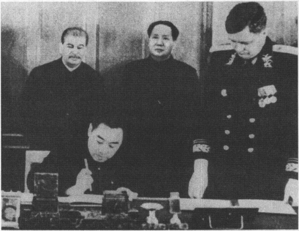 签字仪式在斯大林办公室旁的一个客厅里举行,周恩来和维辛斯基代表本国政府在《中苏友好同盟互助条约》、《关于中国长春铁路、旅顺口及大连的协定》、《关于苏联贷款给中华人民共和国的协定》上签字。他们的身后,并排站着毛泽东、斯大林,以及中方李富春、陈伯达、王稼祥、赛福鼎,苏方莫洛托夫、伏罗希洛夫、马林科夫、米高扬、赫鲁晓夫等。仪式结束后,斯大林举行招待宴会,庆祝两国缔约。毛泽东又邀请斯大林出席第二天在中国大使馆举行的答谢宴会。斯大林是从不到克里姆林宫以外出席宴会的,这一次破例接受邀请,表示对毛泽东的尊重。