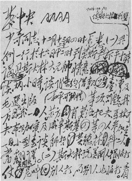 “(一)我们一行于十六日上午十二时到莫斯科,住斯大林别墅。下午十时谒见斯大林大元帅,情意恳切,谈两小时。谈了和平可能性,条约、借款、台湾及毛选出版等项问题。我方为我一人。苏方有莫洛托夫、马林科夫、布尔加宁及维辛斯基等四人参加,是一小型会谈。师哲、费德林科[11]二人当翻译。(二)斯大林说,美国人很怕打仗,美国人叫别人打,别人也怕打。看他这种说法,仗是很难打起来的,和我们的估计一样。(三)关于条约问题,斯大林说,因为雅尔塔协议的原故,目前不宜改变原有中苏条约的合法性。如果改变原有的,重订新的,就会牵连到千岛群岛的问题,美国人就有理由要拿走千岛群岛。因此旅顺为苏联租借三十年一点,目前在形式上不要改变,但在实质上苏联实行撤兵,由中国军队进驻。我说撤得太早也不利。他说可想办法使苏联撤兵不成为袖手不管让中国同志独当其冲。他的意见是,签订一个声明,照上述内容解决旅大问题,如此即可使中共取得政治资本。我说,照顾雅尔塔协议的合法性是必要的。惟中国社会舆论有一种感想,认为原条约是和国民党订的,国民党既然倒了,原条约就似乎失了存在的意义。他说,原条约总是要修改的,大约在两年后可以修改。(四)关于是否要中国外长来此的问题,他说签订一个声明似乎外长不来也可以。我说,待我考虑一下是否连借款、民航、通商等事一起同时签订协定,如果同时签订协定,则外长似宜来此。(五)请你和恩来商量并召集政治局诸同志加以讨论,目前是否有签订一个简单通商协定(包括新疆在内)规定每年交换货物的品种及总数量之可能与必要,以便决定恩来是否来此。同时对上述条约问题提出意见,速告为盼。”[12]