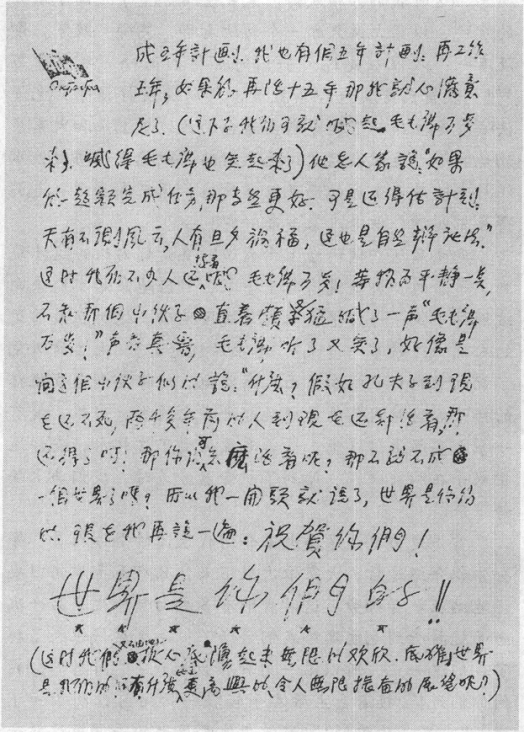“我们的目的就是让全国六亿四千万人一起动手,人人振奋,移风易俗,改造我们的国家。要做到这一点,当然不是很轻易的,问题很复杂。你们看过农业发展纲要四十条没有?(回答:看过!)现在新的四十条出来了。我们要在第二个五年计划内使全部合作社在生产和消费上都超过富裕中农。我曾和不少的省委书记、地委书记谈过话,问他们能否做得到?他们都说完全可能,有的还说能超过。我们现在生产力还很低,钢只有五百二十万吨。过了第二个五年计划后,将有一千二百万吨。再过一个五年计划,钢的产量可以到二千二到二千四百万吨。到第四个五年计划完成时,就会有四千多万吨。我问过波立特同志,再过十五年英国的钢产量可以到多少?他说现在是两千万吨,再过十五年顶多达到三千万吨。那么,再过十五年,苏联超过美国,中国超过英国,那时候世界的面貌就要大大改变了。要完成这个任务还需要十五年,或者为了保险起见,再加一个小尾巴,说:再经过三个五年计划或者再多一点的时间,我们要在钢产量上超过英国。这个责任就落在你们身上了,你们要好好地完成五年计划。我也有个五年计划:再工作五年;如果能再活十五年那我就心满意足了。”(这下子我们可就喊起毛主席万岁来了,喊得毛主席也笑起来了)他老人家说:“如果能超额完成任务,那当然更好。可是还得估计到:天有不测风云,人有旦夕祸福,这也是自然辩证法。”这时我们不少人还接着喊毛主席万岁!等稍为平静一点,不知哪个小伙子直着脖子猛喊了一声“毛主席万岁!”声音真响,毛主席听了又笑了,好像是向着这个小伙子似地说:“什么?假如孔夫子到现在还不死,两千多年前的人到现在还都活着,那还得了啊!那你们可怎么活着呢?那不就不成一个世界了吗?所以我一开头就说了,世界是你们的,现在我再说一遍:祝贺你们!世界是你们的!!”这时我们又不由地从心底涌起来无限的欢欣,的确,世界是我们的!还有什么比这更高兴的、令人无限振奋的展望呢?