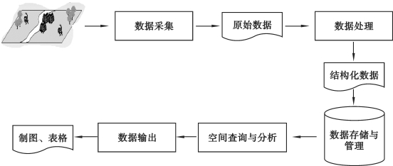 GIS 的基本功能包括数据采集、数据处理、数据存储与管理、空间查询与分析、数据输出等功能。图1.3所示为GIS 基本功能的实现过程。
