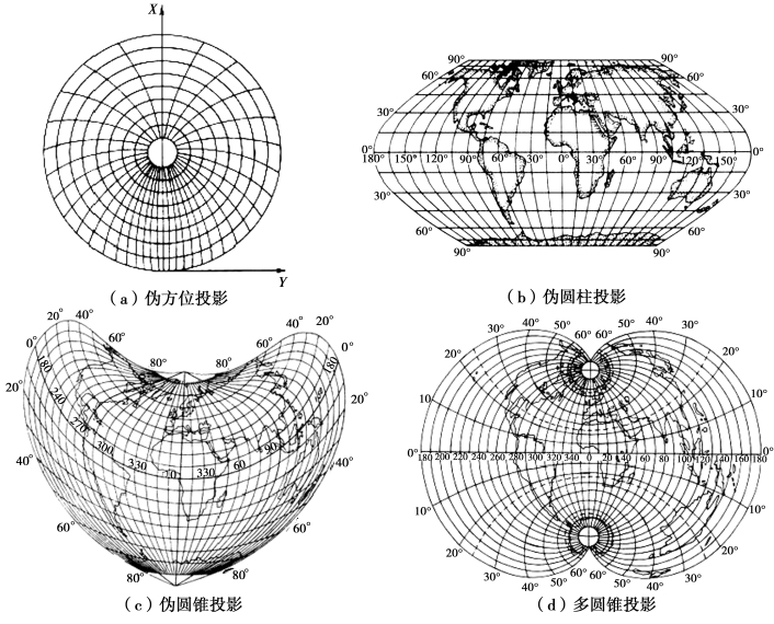 b.非几何投影又称为条件投影,是根据制图的某些特定要求,选用合适的投影条件,利用数学解析法确定平面与球面之间对应点的函数关系,把球面转化成平面。包括伪方位投影、伪圆柱投影、伪圆锥投影、多圆锥投影,如图2.7所示。