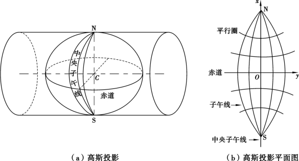 ①高斯-克吕格(Gauss-Kruger)投影概念与特点。在我国基本比例尺地形图中,除了1∶100万地形图是采用等角圆锥投影外,其他比例尺地形图都是采用高斯-克吕格投影。高斯-克吕格投影是一种横轴等角切椭圆柱投影,它是由德国数学家高斯提出,后经克吕格扩充并推导出计算公式,故称为高斯-克吕格投影,简称高斯投影。