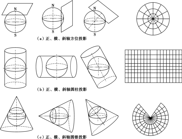 在上述投影中,由于几何面与球面的位置关系不同又可以分为正轴、横轴和斜轴3 种类型,具体如图2.6所示。