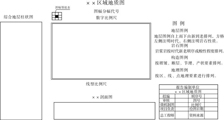 一幅正规的地质图件应有统一的规格,除正图部分外,还应包括图名、比例尺、图例、编图单位、编图日期、地质剖面图和地层综合柱状图等,图2.13所示为某一区域地质图件规格与要求示意图。