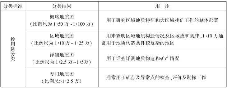按用途可将地质图分为概略地质图、区域地质图、详细地质图、专用地质图,见表2.4。