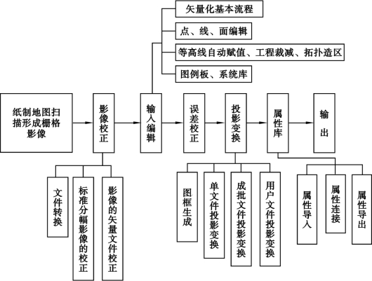 以上流程中主要涉及MapGIS 软件中的“输入编辑”“投影变换”“图像分析”“误差校正”“文件转换”“工程裁剪”“打印输出”“DTM 分析”等功能模块。