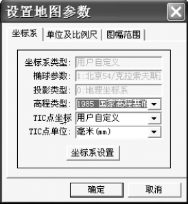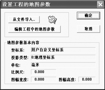 系统要求在新建工程时,先设置好一个图幅的地图参数(实际上它只对地图进行描述,并没有对图形进行控制),它作为以后在添加文件时的比较标准。如果要添加文件的地图参数与预先设置好的不一样时,系统要求进行投影变换或修改地图参数,以保证工程中所有文件的地图参数一致。设置的地图参数内容可以“从文件导入”,也可以自己来编辑(选择“编辑工程中的地图参数”),如图3.9所示。