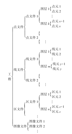 ⑤工程:MapGIS 中用工程来组织管理图形文件(*.WT、.*WL、*.WP)和图像文件(*.MSI)。一个工程(*.MPJ)由一个或一个以上的点文件、线文件、区文件和图像文件(*.MSI)组成。工程、文件、图层之间的相互联系如图3.7所示。