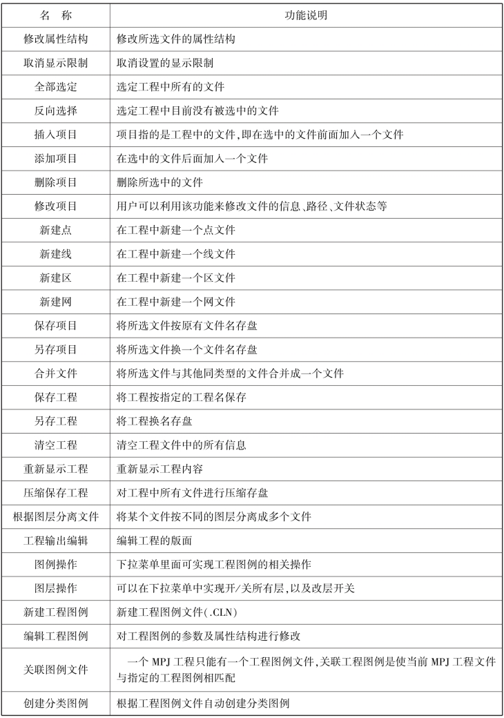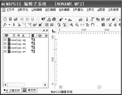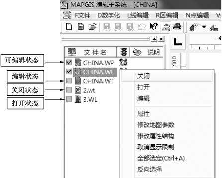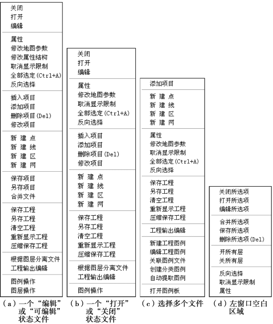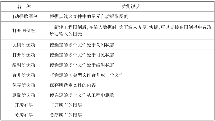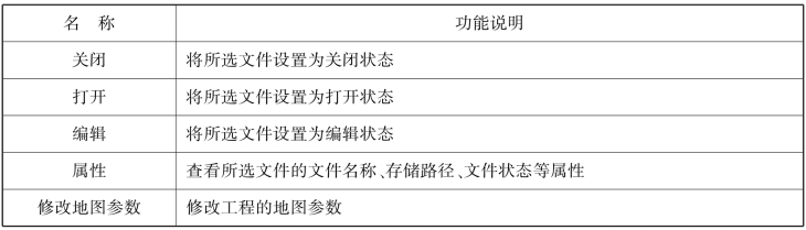 注意:不管一个工程包括多少点文件、多少线文件和多少区文件。在同一时刻同一类型的文件(点、线和区)每次只允许有一个文件处于可编辑修改状态。即在同一工程中,最多只能有3 个文件同时处于编辑状态,分别为点、线、区文件。其余的同类文件则处于只读显示状态或关闭不可见状态,这样就可避免在保存文件时同类型文件的内容发生混乱。