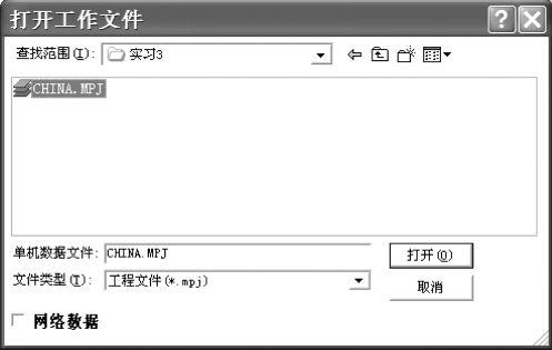 如果选择了“打开工程”,则系统会弹出如图3.12所示的工程文件选择对话框,在该对话框中选择需要打开的工程文件(如CHINA.MPJ),然后单击“打开”,即可将该工程中的所有文件打开,如图3.13所示。