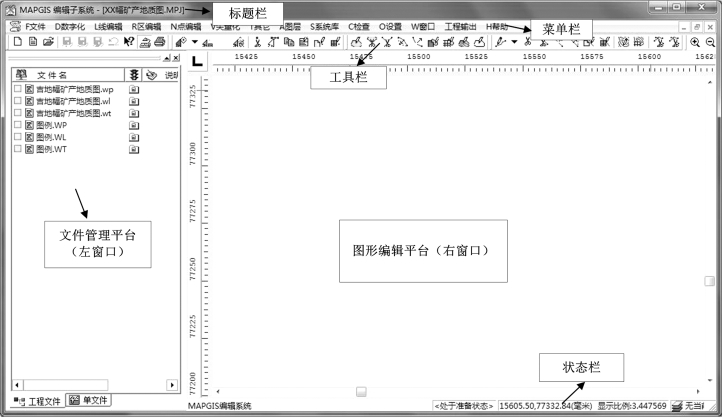 MapGIS6.7 的界面由标题栏、菜单栏、工具栏、文件管理平台、图形编辑平台和状态栏组成。