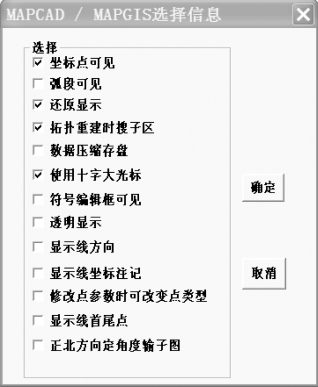 ①坐标点可见。将图元的坐标点或线、弧段上坐标数据点用红色小“+”显示在屏幕上,便于用户编辑。该项初始状态为OFF,每次选择该功能就将该选项状态取反。在ON 状态下,系统将对屏幕上的数据点标上红色“+”。