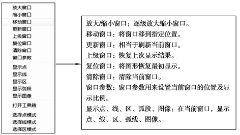 ②右窗口右键菜单功能。在本系统中,鼠标左键和右键经常需要相互切换才能灵活使用。单击右键有且只有两个功能:a.弹出窗口菜单。b.结束用户当前的操作。除此以外的其他功能则都通过鼠标左键实现。左键按下接受用户的输入,右键完成用户的当前操作。在右窗口中单击右键弹出的菜单命令如图3.5所示。