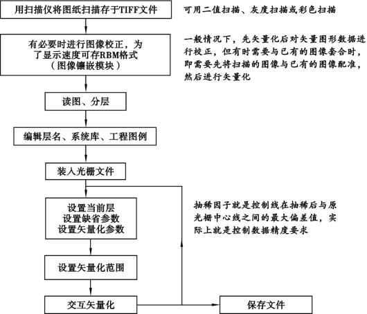 矢量化是把读入的栅格数据通过矢量跟踪,转换成矢量数据。栅格数据可通过扫描仪扫描原图获得,并以图像文件形式存储。本系统可以直接处理TIFF 格式的图像文件,也可接受经过MapGIS 图像处理系统处理得到的内部格式文件(RBM)文件。