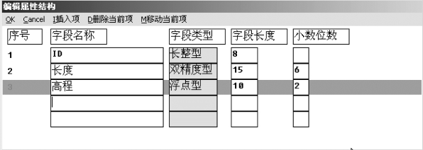 在一个工程中打开一张等值线图并将其设为可编辑状态,单击“线编辑”菜单下“参数编辑”命令中的“编辑线属性结构”命令,然后在弹出的“编辑属性结构”对话框中,给线文件添加一个“高程”属性字段,字段类型必须是浮点型,如图3.18所示。