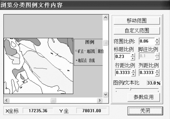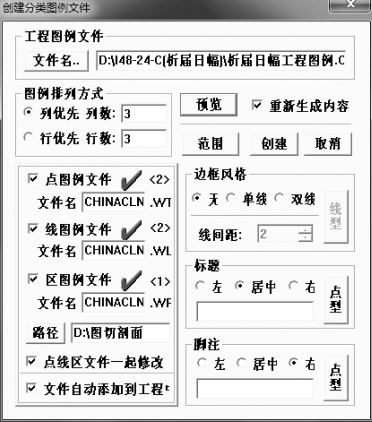第8 步:设置完毕,按预示按钮,预示一下结果,在预览窗口中可调整图例的位置、范围以及行列间距。满意后,单击“创建”按钮就将图例文件添加到工程中,成了图幅的组成部分,如图3.24、图3.25所示。