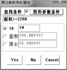 该功能根据图形参数条件和属性条件来确定。属性条件表达式为空时,只根据图形参数条件;图形参数条件没有设置时,只根据属性条件;两项条件都已设置时,将同时满足两项条件。满足条件后欲改的属性项必须确认(打“√”),将满足条件的图元属性更新为用户设置的值。如欲将“面积>=2 200”并且“颜色等于128”的图元的ID 值赋以10,其设置参数如图3.32所示。