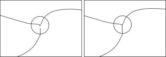 由于数字化误差,几条弧段在交叉处,即结点处没有闭合,留有空隙。为了拓扑处理的需要,也为了保证拓扑关系的严格性,需要将它们在交叉处的端点捏合起来,成为一个真正的结点。结点平差前后的图如图3.31所示。结点平差分为“取圆心值”和“取平均值”两种。