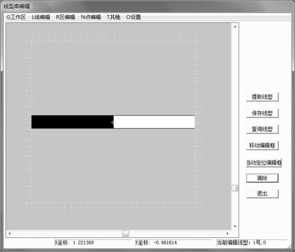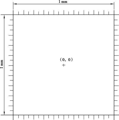 子图、线型、图案的编辑框如图3.39所示,符号编辑框即是一个边长为1 个单位(mm)的正方形,宽和高均20 等分,因此,每一个格子的刻度为0.05 mm,在编辑框中间,有一个十字叉,在造线型时,基线一定经过十字叉(造子图时,控制点的位置就落在十字叉上),十字叉的坐标为(0,0)。
