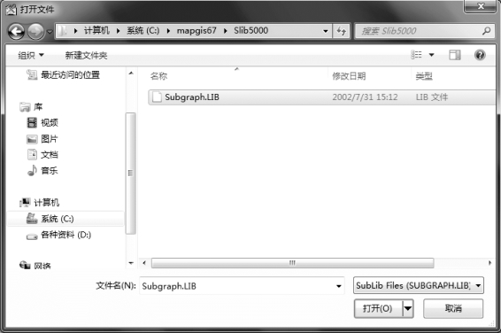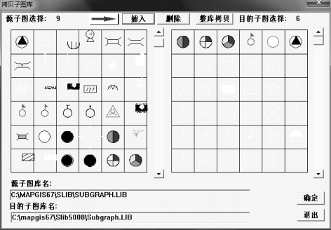 第3 步:系统要求用户选择目的符号库。在此,选择c:\MapGIS6.7\slib5000 的subgraph.lib,如图3.37所示。完毕,弹出“拷贝子图库”对话框。