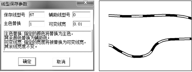 第3 步:保存线型。保存线型时,要输入主替换色。只有当主替换色的参数与造线型时铁路单元的颜色一致,那么在以后的使用过程中,本线型的颜色才可任意改变。线型保存参数及利用该线型绘制的结果如图3.42所示。
