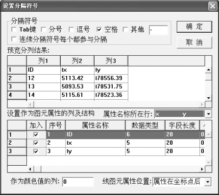 “按指定分隔符”:如果所给文本文件列中除位置坐标外,还有相应的属性数据,而且这些数据还要插入投影生成的图元文件的属性中;或者仅仅想将位置坐标进行投影,而其他信息根据用户需要保留相应列,再写到另一个文本文件中,这时只有使用“按指定分隔符”。选择该选项,则必须通过“设置分隔符”功能按钮来指定分隔符号,分隔数据列,此时“设置分隔符”按钮变为可用。