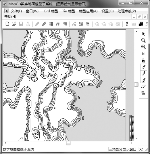 第4 步:参数设置完成后,单击“确定”按钮,即可生成等值线图,结果如图3.98所示,最后保存生成的点线区文件。