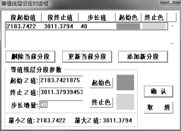 b.单击“等值层值”按钮,系统会弹出等值线层设定对话框,如图3.97所示,在此可以修改高程值之间的间隔,比如将图中的“步长增量”改为40,此时要单击“更新当前分段”按钮,否则修改无效,然后单击“确定”按钮返回到设置等值线参数对话框。
