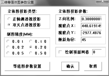 第3 步:单击“三维等值体图参数设置”对话框中的“等值图参数设置”按钮。则系统弹出“设置等值线参数”对话框,如图3.96所示,在“等值线套区”前打“√”,单击“确定”按钮,返回“三维等值体图参数设置”对话框,并单击该对话框中的“确认”按钮,则生成结果文件,如图3.100所示。