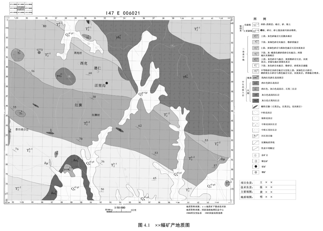 以“××幅矿产地质图”为例进行地质平面图矢量化,为了保密图幅内容,该图幅的矿点、产状、地层、地名等要素在原图基础上进行了删除、新增、移动等修改操作,此图幅只作为示意图,如图4.1所示。
