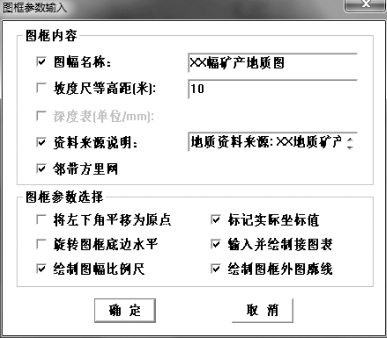 根据表4.1 中读取的坐标网参数(公里网,间距为1 千米)、经纬度范围(起点经纬度:101°00′E,35°00′N)、投影类型(西安80 坐标系,1985 高程系)进行图框参数设置,并输入图框文件名及保存路径,如图4.2所示。设置完成后单击“确定”进行下一步操作。