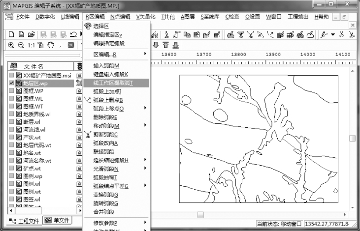 如果之前已经建立了一个空的“地层区.wp”文件,也可将该区文件设置为“可编辑状态”,执行“区编辑”→“线工作区提取弧”命令,如图4.28所示。选择所有需要成区的线段即可将线段转成弧段存入区文件中。线转弧段完成后,将该区文件添加到工程中,并且使它处于“可编辑状态”。