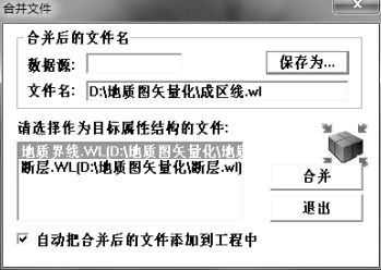 由于本图幅中有部分断层线即是地层分界线,因此,先将前面矢量化的“地质界线.wl”和“断层.wl”两个线文件进行合并,合并方法:将这两个线文件设置为编辑状态,然后单击右键,选择“合并所选项”,在系统弹出的对话框中设置合并后的文件保存路径及文件名(这里保存为“成区线.wl”),并选择一个文件作为合并后文件的属性结构,并在“把合并后的文件添加到工程中”复选框上打钩,如图4.25所示,设置完成后单击“确定”完成两个线文件的合并。后面将利用合并后的“成区线.wl”文件进行拓扑造区。