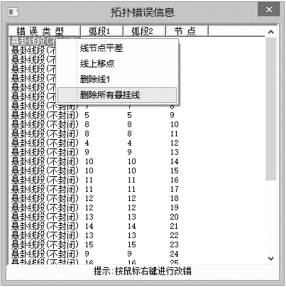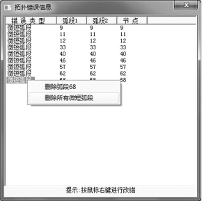 拓扑错误检查是拓扑处理的关键步骤,只有数据规范没有错误后,才能建立正确的拓扑关系。利用此功能可以很方便地找到错误,并指出错误类型及出错位置。查错可以检查重叠坐标、悬挂弧段、弧段相交、重叠弧段,结点不封闭等严重影响拓扑关系建立的错误,在错误信息显示窗口的每一条错误类型上单击鼠标右键,系统将出现修改提示菜单,如图4.27所示。