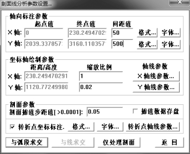 剖面线保存成功后会弹出“剖面线分析参数设置”对话框,进行一些参数的选择,在此主要设置剖面图的间距值及比例尺等参数。
