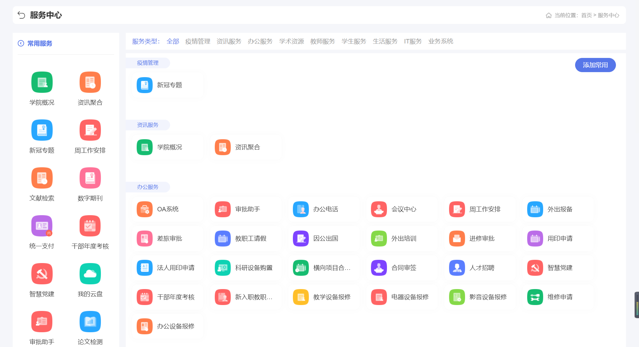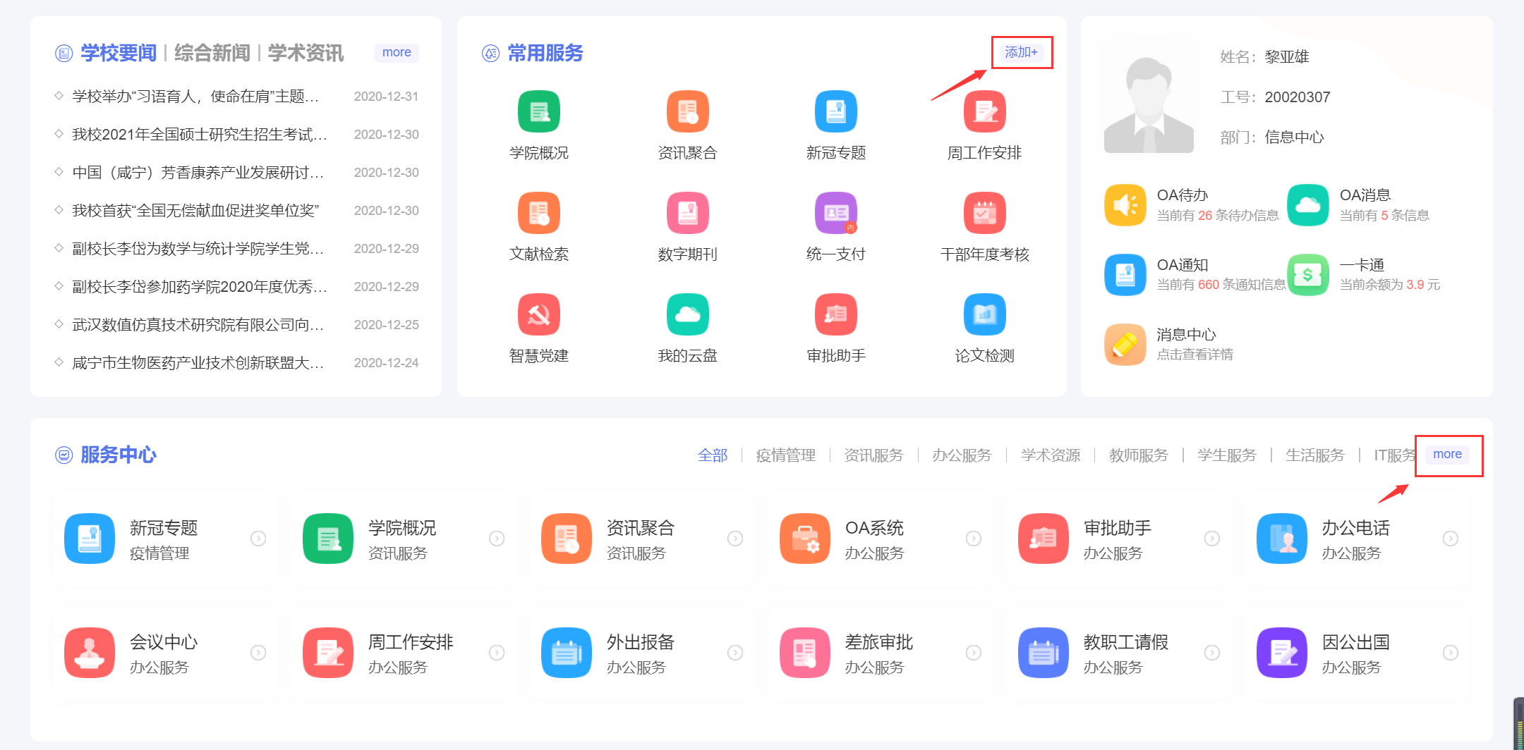 【常用服务】默认推荐部分服务,可以点击【添加+】按钮进入全部服务页面,收藏本人需要的服务。也可以在服务中心模块点击【more】进入全部服务页面,可根据个人喜好收藏常用服务,便于日常使用。