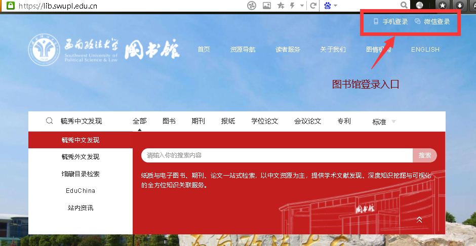 西南政法大学图书馆(https://lib.swupl.edu.cn)提供“手机登录”和“微信登录”两种登录方式。图书馆门户网站同时支持两种方式,图书馆馆藏目录检索系统、微信图书馆、学习通APP仅提供“手机登录”方式。