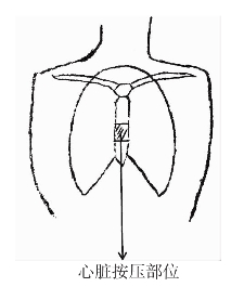 按压时上半身前倾,双肩正对患者胸骨上方,一只手的掌根放在按压部位,另一只手掌根叠放其上,双手指紧扣,双手指离开胸壁,双臂绷直,借助上半身的重力,使掌根垂直向下按压。放松时掌根不能离开胸壁,并让胸廓充分回弹,按压与放松的时间相同,随时注意有无肋骨或胸骨骨折(见图1-2)。