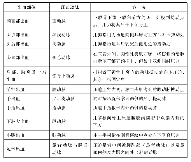 用手指压住动脉出血的血管近心端,阻断血液流通,能简便、有效、快速地达到止血目的,适用于头部和四肢部位的止血。操作要点:①保持伤处肢体抬高;②准确掌握动脉压迫点;③力量适中,以伤口不出血为准;④一般压迫15分钟左右,指压止血适用于短时急救,压迫时间不宜过长。指压止血的应用如表1-1所示。
