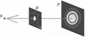 如图2-1所示,S是点光源,D为带有圆孔的不透明屏,圆孔半径可以调节,P为接收屏。当圆孔半径较大时,屏上呈现一个均匀照明有清晰边界的圆形光斑,它是入射光束沿直线投射的结果。随着圆孔半径减小,光斑也相应地变小,当圆孔半径减小到一定程度时,光斑变成一组明暗相间的同心圆环,边缘失去明显的界线,随着半径的变化,衍射花样的中心是亮暗交替变化的。如果用圆屏代替上述圆孔,也可观察到明暗相间的同心圆环,但与圆孔不同的是衍射花样的中心始终是一亮点。