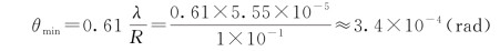 θmin称为光学系统的最小分辨角或角分辨极限,如果l是两个像中心之间的距离,则能分辨两个像的最小间隔,称为分辨极限,为