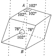 方解石晶体属于六角晶系,其外形为斜平行六面体,在A和B两个顶角处,三个面角均为102°(图3-12),其他六个顶角的三个面角均为一个102°的钝角和两个78°的锐角。连接A和B的对角线就是方解石的光轴。