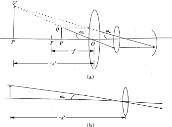 凸透镜就是一个简单的放大镜,在图5-6(a)中,物体PQ置于凸透镜的物方焦点与透镜之间,并接近于物方焦点处。这时,在透镜后面的观察者所看到的是由透镜所成的一个放大的虚像P'Q',由于眼睛是紧贴着透镜的,所以像对眼睛瞳孔所张的视角ωa近似等于它对透镜光心O所张角度ωo,因此通过放大镜观察物体时的视角为