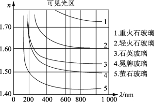 反映折射率与波长的函数关系n=f(λ)的曲线称为色散曲线。利用棱镜测量出不同波长入射光的最小偏向角,再根据最小偏向角与材料折射率的关系可得到棱镜材料的色散曲线,图6-6是在可见光范围内几种透明介质的色散曲线。