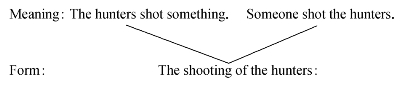 For example,the phrase“the shooting of the hunters”is ambiguous because the one form has two meanings: