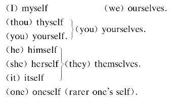 When the subject and object are identical,we use for the latter a so-called reflexive pronoun,formed by means of self,e.g.I defend myself.The pronouns are the following;