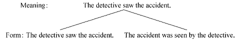 In structural terms,the two sentences above are totally unrelated.The subject noun of the active sentence is dentist,while the subject noun of the passive is accident.The verb of the active sentence is see in the past tense.The verb of the passive sentence is was plus see in the past participle form.The object of the active sentence is accident,while in the passive sentence it is dentist.Despite these obvious differences,every speaker of English knows that in a very profound sense these two sentences are basically the same.Furthermore,we all know that the passive is a kind of alternative version of the active,and not the other way around.Paraphrase relations are a second way in which our knowledge of the language cannot be accounted for in terms of lexical meanings of words and structural signals.