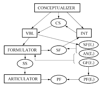 One has nothing to say about the various sorts of input to the conceptualizer and the way in which it generates a conceptual structure CS.In the light of what has been said earlier,one has to assume,however,that there is a mechanism that takes CSasinput and realizes the mapping Vbl.This mechanism has to affect two things:first,it must split up CS into chunks that can be lexicalized.thereby registering the relation between them and making them available for the formulator;second,it must feed chunks into the system of lemmas where they must be matched with the semantic form SF(Ei)of appropriate lexical entries Ei.The selection of some SF(Ei)is directly connected with the determination of the argument structure AS(E1)and the grammatical features GF(Ei).Both of which must be available to the formulator,which constructs the syntactic structure SS in accordance with the relational information provided by Vbl.The integrated semantic form SF,compiled from the SF(Ei)of the accessed lexical items of an utterance,is best understood as a criterion against which monitoring of the result of lexical access and integration into a connected utterance structure is possible.This monitoring must be effected by the interpretation mechanism Int.which also maps SF into CSin language comprehension.