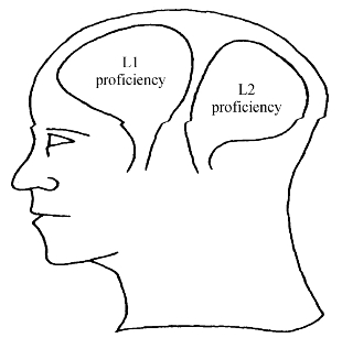 The balance and balloon picture theories of bilingualism and cognition appear to be held intuitively by many people.Many parents and teachers,politicians and large sections of the public appear to latently,subconsciously take the balloon picture as the one that best represents bilingual functioning.Cummins(1980a)refers to this as the Separate Underlying Proficiency Model of Bilingualism.This model conceives of the two languages operating separately without transfering and with a restricted amount of‘room’for languages.